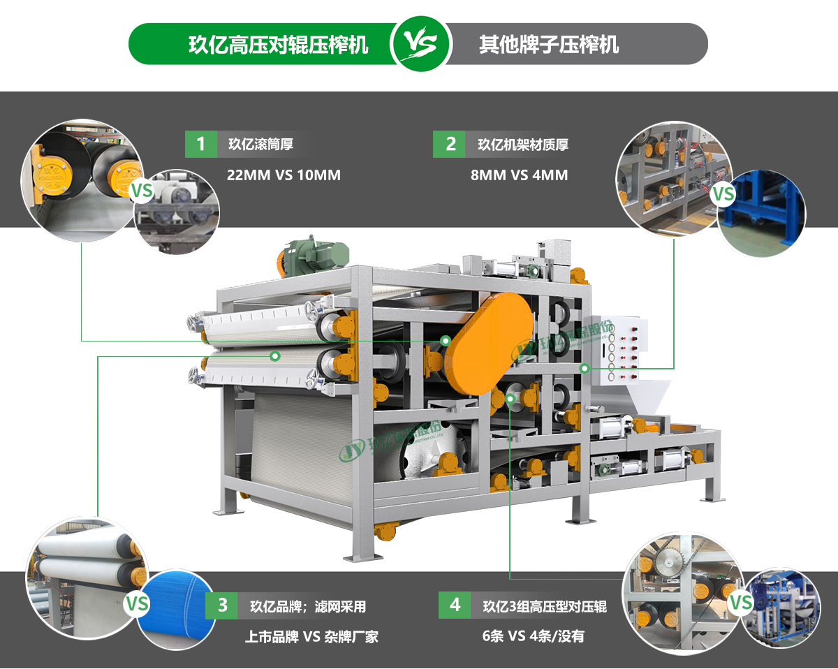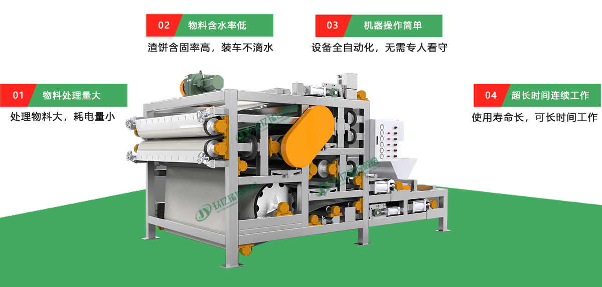 中药渣经过输送机,输送到高压对辊压榨脱水机的布料器中,通过螺旋布料器均匀平铺在网带上,同时控制好平铺在网带上厚度,网带随着设备的运行,然后上下两条完全涨紧的环状网带夹住药渣,在驱动辊带动下,分别通过预压脱水区和三组对辊高压区进行对辊连续多次机械物理挤压,将大量的水份压出。根据物料的特性调节挤压力度,满足客户对物料水分要求。